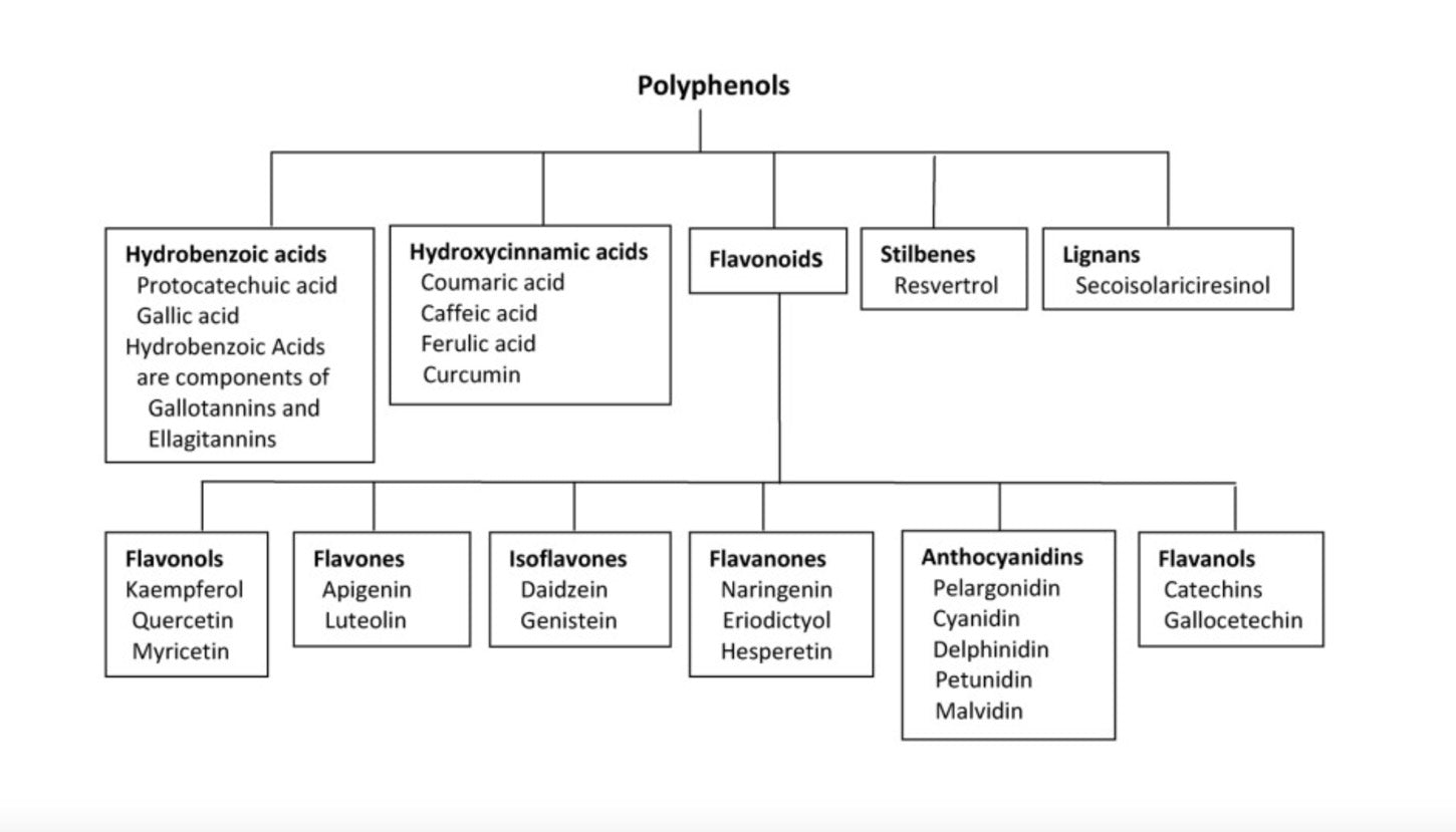 Polyphenols are grouped in 4 major classes: phenolic acids, flavanoids, stilbenes and lignans.