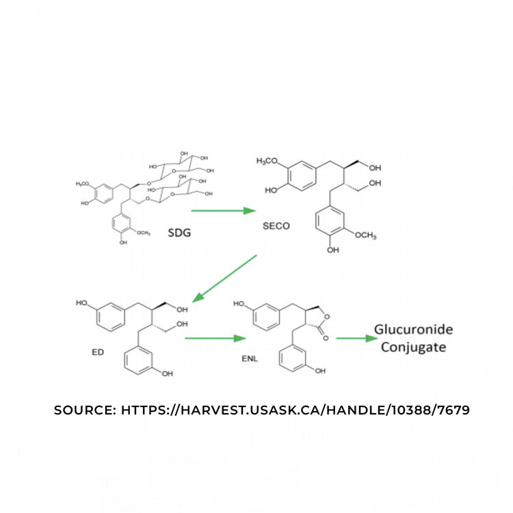 Flaxseed lignans on the other hand need to go through a multiple step process. Flaxseed contains a large amount of the lignan precursor secoisolariciresinol diglucoside (SDG). SDG then gets metabolized in the gut to the lignan secoisolariciresinol (SECO). SECO then gets broken down by the microflora into mostly ED . ED is then partially converted into ENL in the colon. (52)(51)