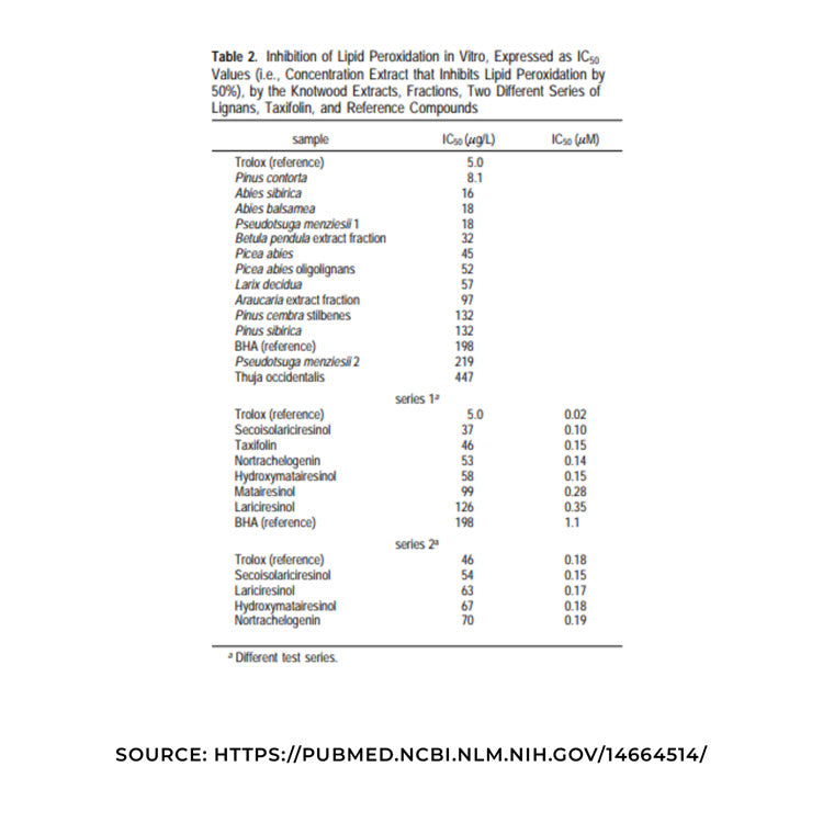 HMR, the lignan found in the Norwegian Spruce knotwood, is also known to be a powerful antioxidant. When comparing to Trolox (the reference for anti-oxidation) HMR ranked higher than SECO, the major lignan in flaxseed, as an anti-oxidant. (106)