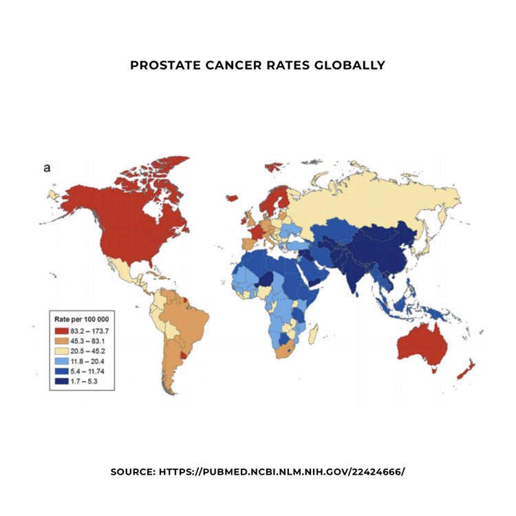 Prostate cancer is the second most common cause of cancer among men worldwide. Similar to what is seen with breast cancer, incidence of prostate cancer is highest in North America and Europe, with Asian populations showing lower incidence of the disease. (63) (79) Incidence rate and mortality rates are 60 and 17 times higher respectively when comparing the United States and China . (25)